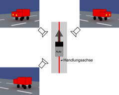 Dies mag für Dialoge oder zielgerichtete Handlungen, wie beispielsweise das Zubereiten eines Tees, gelten. Wie sieht es aber bei Handlungen aus, die von der räumlichen Beziehung der Personen leben und nur über zwei Einstellungen hinweg verstanden werden können? Bei Verfolgungsjagden beispielsweise sieht man meist nur ein Fahrzeug pro Einstellung, bevor das andere Fahrzeug in der nächsten Einstellung gezeigt wird. Woher wissen die ZuschauerInnen, dass sich diese Fahrzeuge verfolgen? Der/die ZuschauerIn muss erkennen, wie sich jedes einzelne Auto in Relation zu seiner filmischen Umwelt bewegt, und muss diese Information über filmische Schnitte hinweg integrieren. Nur so kann letztendlich der Eindruck entstehen, dass sich zwei Autos verfolgen. Bei den sehr kurzen Einstellungslängen (von zum Teil unter einer Sekunde) muss dies alles sehr schnell passieren. Und zwar wird dabei nicht unbedingt die filmische Umwelt als Referenz genommen, sondern die dynamisch räumliche Information auf dem abbildenden Bildschirm. Das heißt, fuhr ein Fahrzeug in der ersten Einstellung auf dem Bildschirm nach links und ein anderes Fahrzeug in der zweiten Einstellung ebenfalls, nahmen die meisten ZuschauerInnen dies als eine Verfolgungsjagd wahr. Fuhren die beiden Autos dagegen in unterschiedliche Richtungen auf dem Bildschirm, wurde dies nicht als Verfolgungsjagd wahrgenommen. Das heißt, die räumlichen Informationen der Fahrzeuge werden heuristisch verarbeitet (Huff & Schwan, 2012). Nur wenn die Umweltinformationen widersprüchliche Informationen lieferten, wenn durch Missachtung der 180° Regel beispielsweise ein Baum oder ein Haus plötzlich auf der anderen Straßenseite stand, wird diese heuristische Verarbeitung gestört und die ZuschauerInnen verarbeiteten die ihnen zur Verfügung stehenden Informationen in elaborierter Art und Weise.