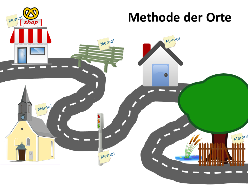 me in einem Palast. Die Merkstrategie besteht nun darin, die Orte nacheinander abzugehen und je einen Ort mit einem zu memorierenden Gedächtnisinhalt zu verknüpfen. Dazu denkt man sich eine besonders außergewöhnliche, humorvolle, gut zu visualisierende und bewegte Geschichte aus, die Ort und Gedächtnisinhalt verbindet. Für den Abruf geht man die Orte nacheinander im Geist ab und decodiert die Geschichte. Hat man erst einmal die Abfolge der Orte erlernt, können sie nun als Anker für alles Mögliche zum Beispiel Telefonnummern, Einkaufs- oder To-do-Listen immer wieder benutzt, quasi neu „beschrieben“ werden. Bei den RednerInnen in der Antike soll diese Technik genutzt worden sein, um den Aufbau ihrer Reden auswendig zu lernen.