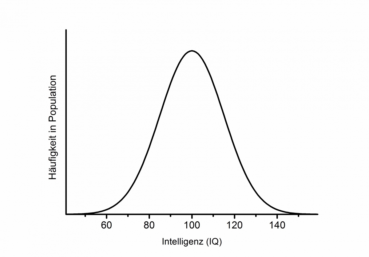 Das letztendliche Ziel der molekulargenetischen Intelligenzforschung sollte es sein, genau diese neurobiologischen Pfade aufzuklären, die über verschiedene Betrachtungsebenen zwischen genetischen Unterschieden auf der einen und kognitiven Leistungsunterschieden auf der anderen Seite vermittelt (siehe Abbildung 2). Dazu ist es aber zunächst notwendig, genetische Varianten zu identifizieren, die in einem verlässlichen Zusammenhang mit der Intelligenz stehen. Doch nach wie vielen SNPs suchen wir überhaupt? Diese Frage ist nicht einfach zu beantworten, allerdings lässt sich aus einer genaueren Betrachtung der Verteilung des Merkmals „Intelligenz“ in der Bevölkerung der Schluss ziehen, dass eine Vielzahl von SNPs beteiligt sein müssen. Abbildung 3 zeigt die typische glockenförmige Verteilung, die man erhält, wenn man die Häufigkeit von verschiedenen Intelligenzausprägungen untersucht: Sehr viele Individuen haben eine mittlere Ausprägung, einige Individuen eine hohe oder niedrige und nur sehr wenige eine extreme Ausprägung. Da die Hälfte der Unterschiede im Merkmal Intelligenz auf genetische Faktoren zurückzuführen ist, würde bei der Beteiligung nur einer Genvariante keine glockenförmige Verteilung mit einem Gipfel in der Mitte, sondern eine Verteilung mit zwei Gipfeln zu erwarten sein: Der weiter links gelegene Gipfel würde Menschen vereinen, die ein Allel tragen, das zu einer geringeren Merkmalsausprägung führt, während der weiter rechts gelegene Gipfel Menschen vereinen würde, die ein Allel tragen, das die Intelligenz fördert (siehe Montag & Reuter, 2014). Je mehr SNPs zu Intelligenzunterschieden beitragen, desto geringer fällt natürlich der Beitrag eines einzelnen SNPs aus. Schätzungen gehen davon aus, dass der Beitrag eines einzelnen SNPs zu den Gesamtunterschieden zwischen Menschen unter 1 % liegt (Plomin, Kennedy & Craig, 2006). Dies bedeutet, dass es kein einzelnes „Intelligenzgen“ gibt, sondern genetisch bedingte Unterschiede im Merkmal Intelligenz von einer Vielzahl von Genen verantwortet werden.