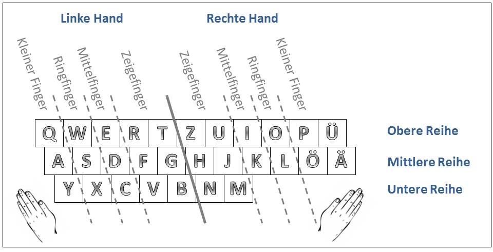 Aufgrund der Komplexität der Tipphandlung benötigt das Erlernen flüssigen Maschinenschreibens enormen Zeitaufwand. Wahre Meister im Maschinenschreiben können nach jahrelang erworbener Expertise durchaus beeindruckende Leistungen erzielen, indem bis zu 18 Tastendrücke pro Sekunde möglich sind. Betrachtet man zunächst die Leistung eines Tippanfängers bzw. einer Tippanfängerin, fällt auf, dass Lesen und Schreiben sich zunächst abwechseln. So muss die Information zuerst gelesen werden, um anschließend getippt werden zu können. Die Tastendrücke an sich werden dabei durch visuelle Suche initiiert. Der Novize bzw. die Novizin verwendet dabei in der Regel nur wenige Finger (z. B. lediglich die beiden Zeigefinger). Natürlich leuchtet es sofort ein, dass es mit dieser Methode kaum möglich sein wird, 18 (korrekte!) Tastendrücke pro Sekunde zu erzielen. Vielmehr erreichen Tipp-AnfängerInnen nur durchschnittlich zwei Tastendrücke pro Sekunde. Dieser enorme Schritt von 2 auf 18 Anschläge pro Sekunde ist nur erreichbar, wenn die Tipphandlung durch permanente Wiederholung automatisiert wurde. Tipp-ExpertInnen können nach erworbener Automatisierung parallel lesen und schreiben, da sich im Zuge des Expertise-Erwerbs ein Gedächtnis für die Tastenlokalisation herausgebildet hat. Zudem verwenden ExpertInnen im Unterschied zu NovizInnen alle zehn Finger zum Tippen, wobei es eine feste Zuordnung von Fingern zu spezifischen Tasten gibt. So wird etwa die Taste [F] immer mit dem Zeigefinger der linken Hand betätigt (siehe Abbildung 1). Insgesamt betrachtet verbessert sich also durch erworbene Expertise nach und nach die allgemeine Performanz, das heißt, das Maschinenschreiben gelingt zunehmend schneller und akkurater.