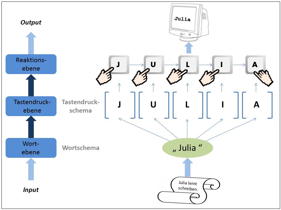 Neben der Untersuchung des Expertise-Erwerbs haben sich ForscherInnen damit beschäftigt, systematisch zu untersuchen, wie die Tipphandlung an sich durch den kognitiven Apparat gesteuert wird. So haben etwa Rumelhart und Norman (1982) ausgehend von einer Computersimulation eine Theorie entwickelt, die geeignet ist, um die komplexen Prozesse des Tippvorganges beschreiben zu können (siehe Abbildung 2). Die Autoren gehen davon aus, dass die Tipphandlung über drei hierarchisch angeordnete Verarbeitungsschritte gesteuert wird. Auf der ersten Verarbeitungsebene – der sogenannten Wortebene – wird die Information, die es zu tippen gilt, in Einzelwörter unterteilt, wobei jedes Wort in ein Wortschema überführt wird. Auf der Tastendruckebene wird anschließend für jeden Einzelbuchstaben, welcher im Wortschema beinhaltet ist, ein Tastendruckschema aktiviert. Dieses spezifiziert, welcher Finger welcher Hand zu welcher Zielposition geführt werden muss, um die korrekte Taste zu betätigen. Dabei inhibiert jedes Tastendruckschema das entsprechende Schema des nachfolgenden Buchstabens in der Sequenz. Auf der dritten Verarbeitungsebene – der Reaktionsebene – werden die Tastendruckschemata schließlich motorisch ausgeführt. Dabei wird das am stärksten aktivierte Tastendruckschema (= der erste Buchstabe im Wort) zuerst ausgeführt. Dies führt dazu, dass die Inhibition des Schemas des nachfolgenden Buchstabens nachlässt, wodurch wiederum dieses die stärkste Aktivation erhält und darum folglich als nächstes ausgeführt wird usw.