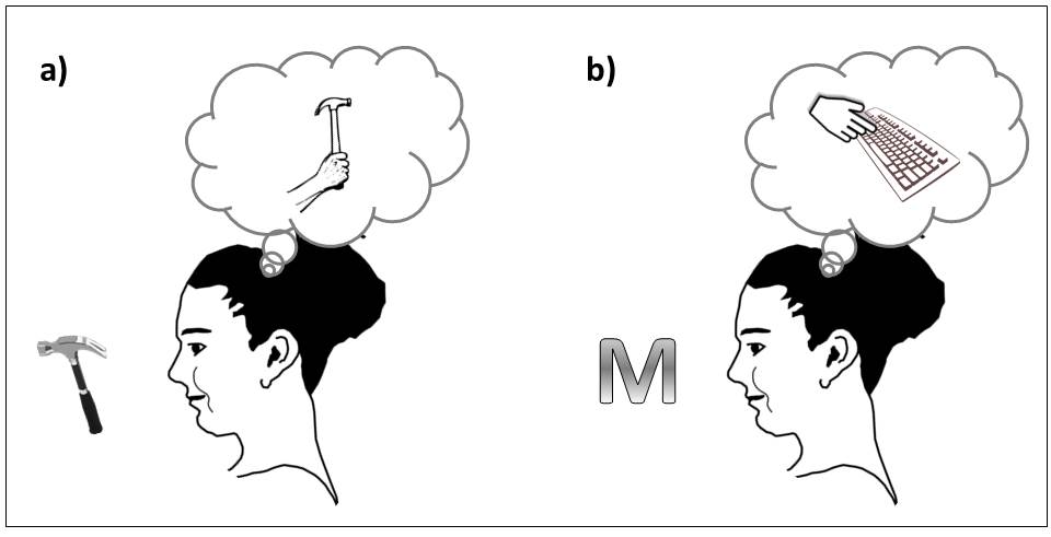 Ein weiterer Forschungsansatz, um zu untersuchen, inwieweit die Verarbeitung von Buchstaben automatisch durch deren Lokalisation auf der Tastatur beeinflusst wird, beinhaltet die Analyse der Präferenz für bestimmte Buchstaben (oder Buchstabenkombinationen). Nach der Embodiment-Theorie fußt menschliches Denken zum Teil auf sensumotorischen Simulationsprozessen (Barsalou, 1999). Die Idee dahinter ist, dass motorische Reaktionen, die typischerweise mit einem Stimulus assoziiert sind, unbewusst mental simuliert werden, sobald man mit diesem Stimulus konfrontiert ist oder auch nur an ihn denkt (siehe Abbildung 3a). Evidenz für diese These stammt unter anderem von Chao und Martin (2000), die zeigen konnten, dass beim bloßen Betrachten eines Werkzeuges bereits erhöhte neuronale Aktivität im motorischen Kortex gemessen werden kann – also in den Hirnarealen, die für das tatsächliche Ergreifen des Gegenstandes zuständig sind.