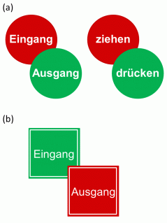 Beispiele für solche Regelmäßigkeiten finden sich natürlich auch außerhalb des Straßenverkehrs. In unserem Alltag begegnen uns häufig Aufkleber auf Türen mit der Inschrift „ziehen“ / „Eingang“ oder „drücken“ / „Ausgang“, die uns dazu anleiten sollen, die richtige Reaktion auszuführen. Typischerweise sind diese Inschriften auf bestimmten Hintergrundfarben gedruckt („Eingang“ und „ziehen“ sind oft rot hinterlegt; „Ausgang“ und „drücken“ dagegen sind grün hinterlegt, siehe Abb. 4a). Die Hintergrundfarbe des Aufklebers wird dann ebenfalls mit der instruierten Reaktion assoziiert, was eine Aktivierung der geforderten Reaktion zusätzlich befördert. An dieser Stelle ist jedoch zu sagen, dass irrelevante Reize unzuverlässige Hinweisreize für korrektes Verhalten sind. Entsprechend konnte gezeigt werden, dass der durch irrelevante Reize ausgelöste automatische Reaktionsabruf auch zu Fehlern oder verlangsamten Reaktionen führen kann, nämlich immer dann, wenn die abgerufene Reaktion in der aktuellen Situation unpassend ist (Rothermund et al., 2005). Würden Sie beispielsweise Ihre Handlungen allein durch die reaktionsirrelevante Farbe eines Hinweisschildes an einer Tür lenken lassen, würde ein rotes Schild mit der Aufschrift „Ausgang“ die falsche Reaktion (an der Türe zu ziehen) auslösen (siehe Abb. 4b).