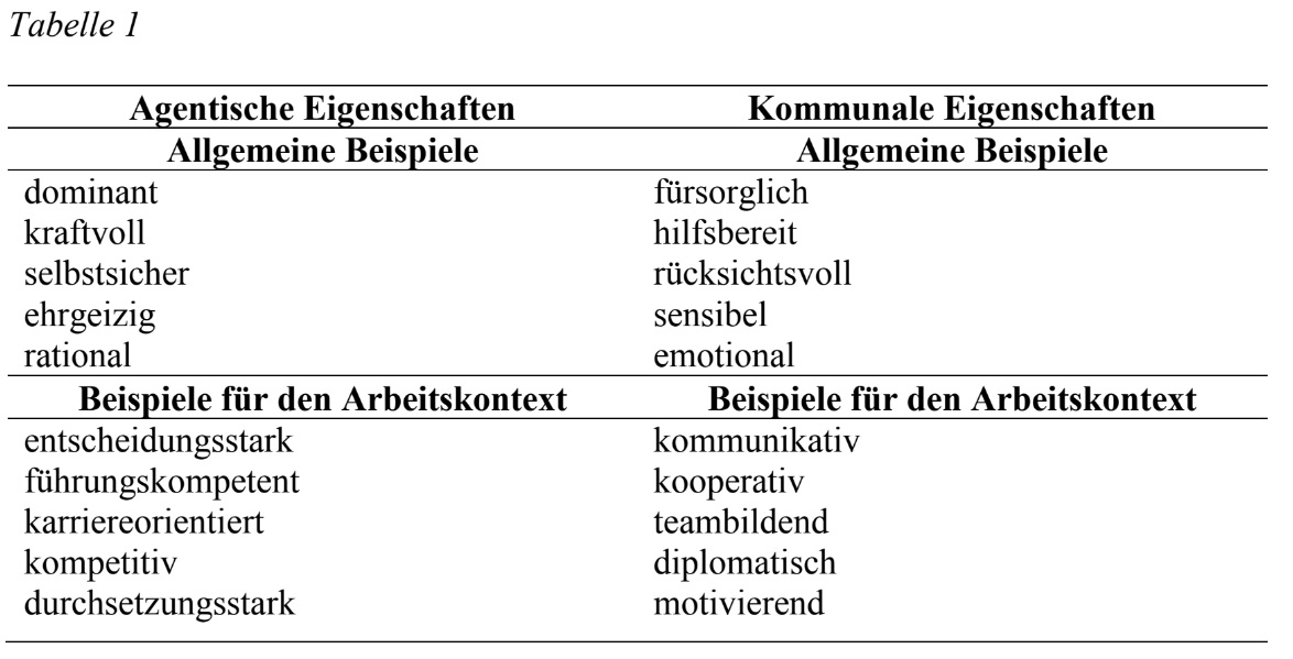 Wenn wir Menschen befragen, wie sie sich selbst sehen und beschreiben, haben diese meist ein klares Bild von sich: Frauen beschreiben sich – mehr als Männer – mit sogenannten „kommunalen“ (von engl. communal) Eigenschaften. Diese stehen für Beziehungs- und Gemeinschaftsorientierung wie beispielsweise hilfsbereit, empathisch oder emotional. Männer beschreiben sich – mehr als Frauen – mit sogenannten „agentischen“ (von engl. agency) Eigenschaften. Diese stehen für Aufgaben- und Leistungsorientierung wie beispielsweise dominant, durchsetzungsstark oder führungskompetent (Hentschel, Heilman & Peus, 2013).