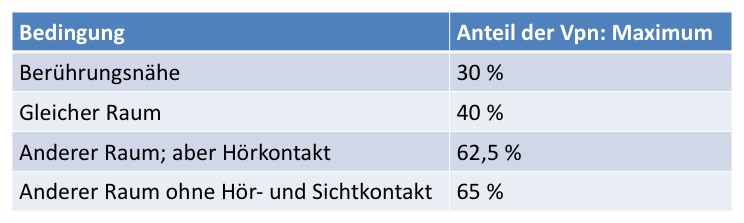In seiner Studie untersuchte Milgram auch die Auswirkungen der räumlichen Nähe zwischen Schüler und Versuchsperson, indem er vier verschiedene Gruppen von Versuchspersonen miteinander verglich. Eine Gruppe von Versuchspersonen saß dabei dem Schüler in direkter Berührungsnähe gegenüber, eine andere Gruppe saß mit etwas mehr Abstand zumindest im selben Raum wie der Schüler, eine weitere Gruppe saß in einem anderen Raum und hörte die schmerzhaften Reaktionen des Schülers nur über Lautsprecher und eine letzte Gruppe saß in einem anderen Raum, ohne den Schüler zu hören oder zu sehen.