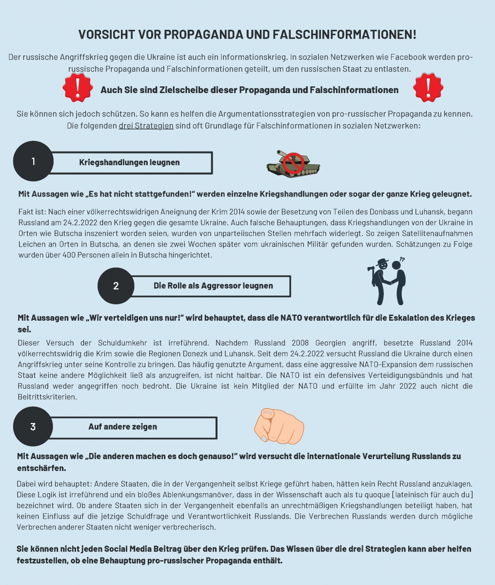 Verschiedene Organisationen, Journalist:innen und Forscher:innen beobachten und analysieren seit vielen Jahren russische Desinformationskampagnen. Russische Desinformation im Kontext des russischen Angriffskriegs gegen die Ukraine umfasst irreführende, inakkurate oder frei erfundene Informationen, welche Russland in einem positiven Licht darzustellen und gleichzeitig die Ukraine sowie deren Verbündete diskreditieren (Ziemer et al., 2024). Dabei ist russische Desinformation sorgfältig ausgearbeitet und greift – je nach Zielpublikum – regionale Schwachstellen wie anti-westliche Einstellungen (z.B. in Ländern Lateinamerikas oder Afrikas) oder historische Verbundenheit auf (z.B. ehem. Sowjetstaaten/deren Verbündete; Krainikova & Prokopenko, 2023). Drei prominente russische Desinformationsnarrative im Kontext des Angriffskriegs gegen die Ukraine sind: (1) „Es hat nicht stattgefunden“ (z.B. werden Kriegsverbrechen wie Butscha geleugnet und als ukrainische Inszenierung dargestellt), (2) „Der Westen ist schuld“ (z.B. wird behauptet, die Vergrößerung der NATO ließ Russland keine andere Wahl als ihr Einflussgebiet zu sichern) und (3) „Andere machen dasselbe“ (der Krieg wird z.B. dadurch begründet, dass Staaten wie die USA in der Vergangenheit ebenso unrechtmäßige Kriege geführt haben).